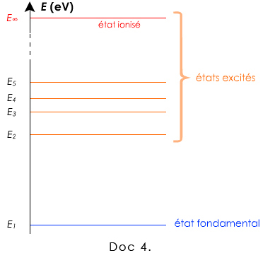 Si hν correspond à un écart entre deux niveaux, l’atome passe au niveau supérieur lors de cette transition énergétique : il y a absorption du photon et l’atome se retrouve dans un état excité (doc.5).
